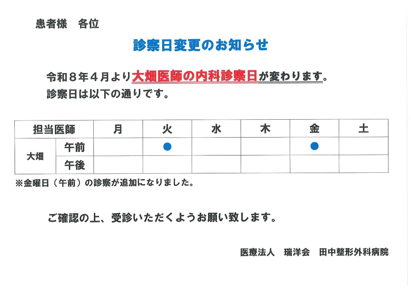 令和8年4月より大畑医師の内科診察日変更のお知らせ