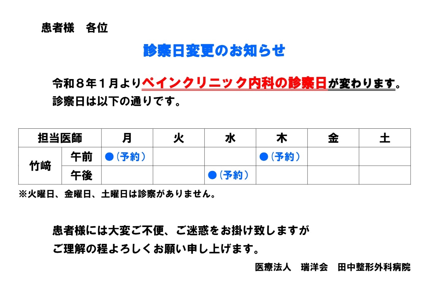 令和8年1月よりペインクリニック内科の診察日変更のお知らせ